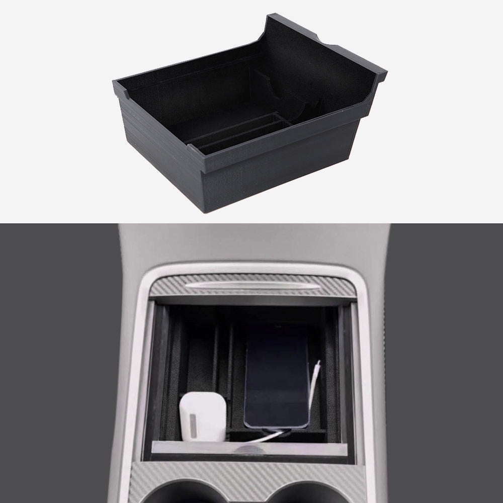 Organizer für die Mittelkonsole vom Tesla Model 3 Refresh und Model Y mit einer Öffnung im Boden der Box um ein Handy-Ladekabel durchführen zu können.