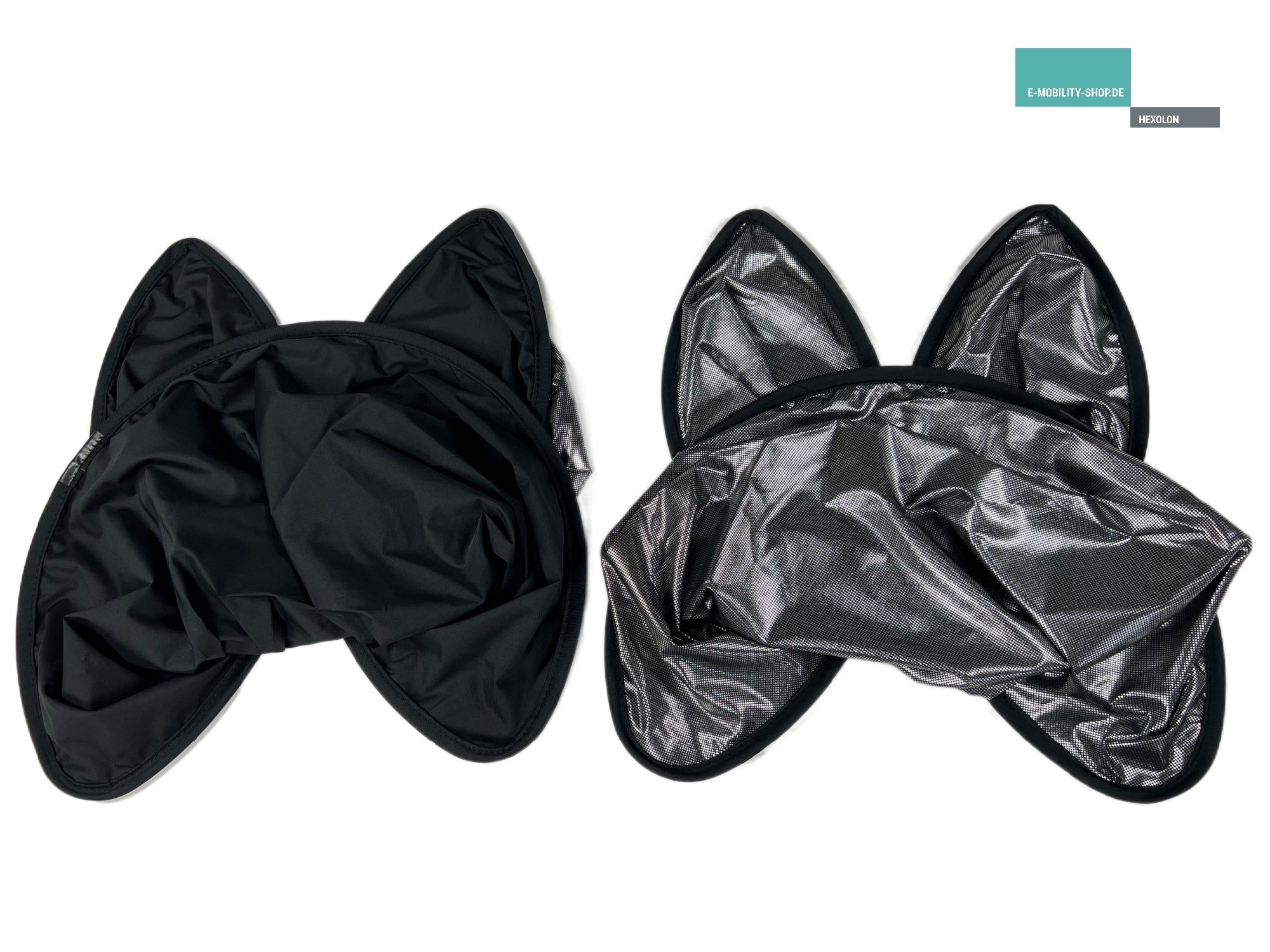 Das Set besteht aus zwei Sonnenschutzelementen, die auf der Oberseite mit silbernen Bedurckungen die Sonne nun noch besser ausserhalb vom Auto hält.